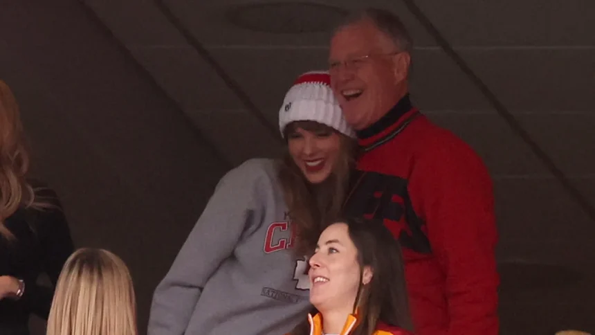 Taylor Swift is continuing to support Travis Kelce at his football games, this time by bringing her dad, Scott Swift, to join in on the fun.